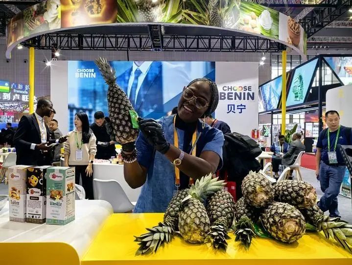 2024年11月7日,在上海举行的第七届中国国际进口博览会上,贝宁国家馆工作人员展示本国特色农产品——贝宁菠萝。新华社记者 郝王乐 摄