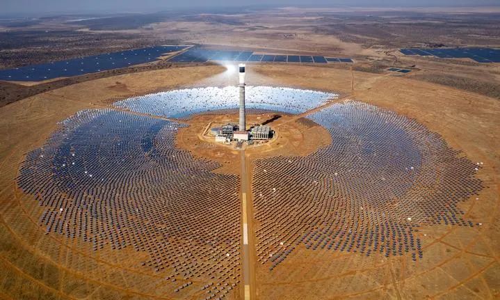 这是2024年8月20日在南非北开普省拍摄的由中国电建集团山东电建三公司承建的南非红石100兆瓦塔式熔盐光热电站项目(无人机照片)。新华社记者 张誉东 摄