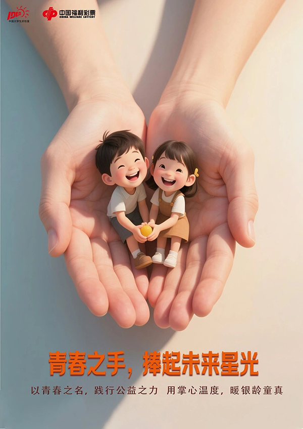 点评:青春“益”手,用“青春之手托举老人、孩童”的具象画面,将“助老、护童”的公益行动转化为充满力量与温情的视觉语言,手掌的包容感与被托举者的幸福感形成强烈情感共鸣,直观诠释“青春助力公益”的主题。