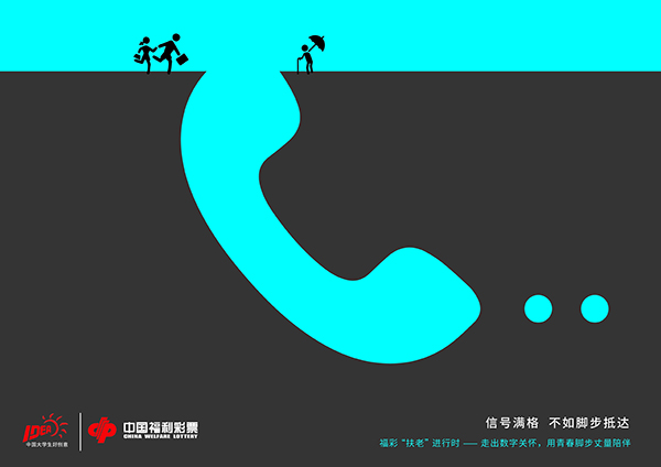 点评:《福彩公益:超越数字,真实陪伴》,高饱和色彩的符号与黑灰背景形成视觉张力,极简的人物剪影强化了“行动”的表意,让公益呼吁更具穿透力,传递出福彩公益“回归线下、践行真实关怀”的价值导向。