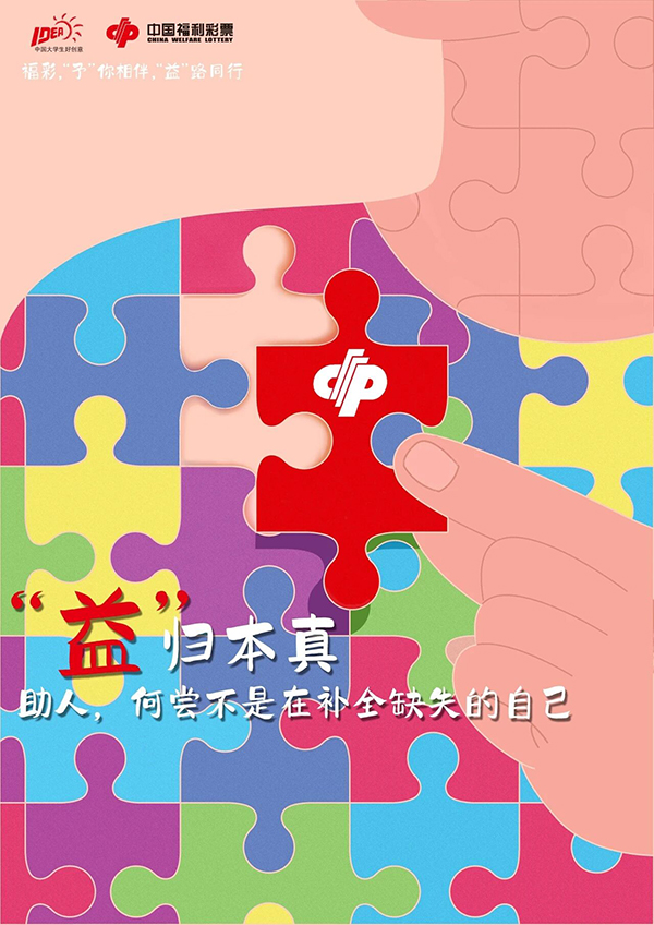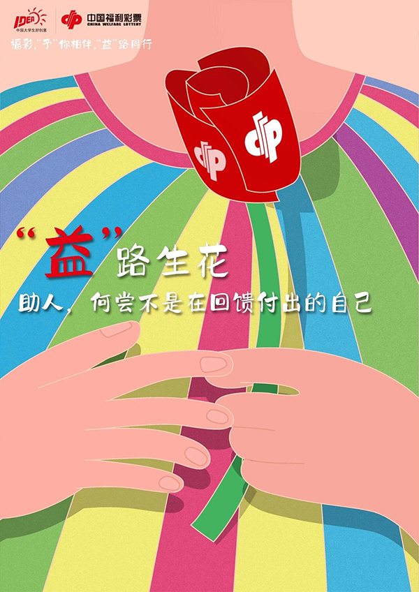 点评:“予”你相伴,“益”路同行。多彩的画面风格充满活力,福彩标识与创意符号的融合自然且醒目,既强化品牌识别度,又通过温暖的视觉语言消解公益的沉重感,让“益路同行” 的理念更具吸引力与传播力。