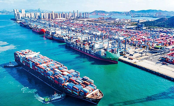 中国(山东)自由贸易试验区青岛片区挂牌六年来,通过创新“区关港+”联动机制等百余项举措,为畅通国内国际双循环提供了坚实的物流支撑。图为2025年11月5日,一艘货轮满载货物驶出青岛片区港口。 新华社发 张进刚/摄