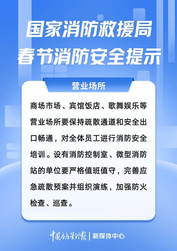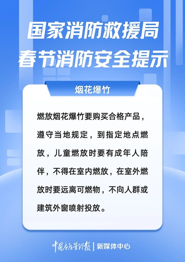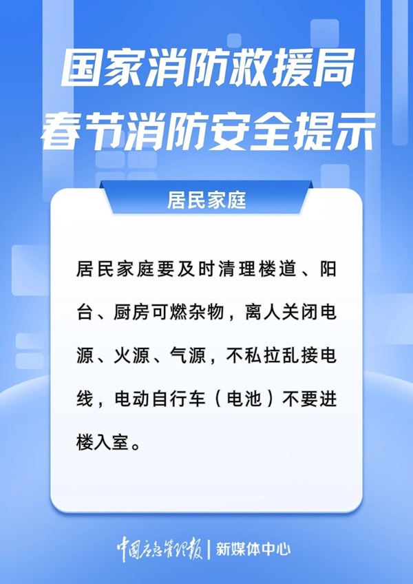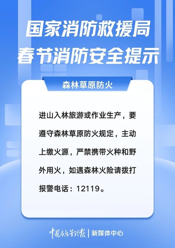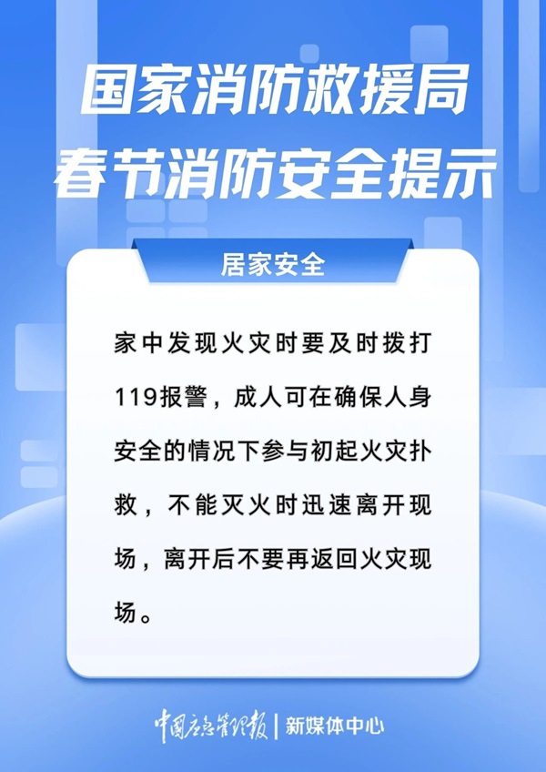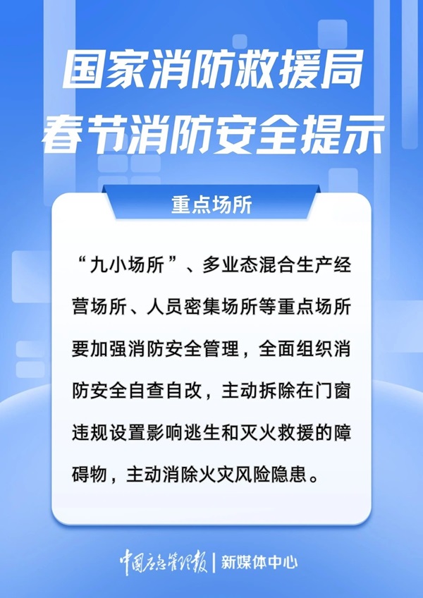 春节期间客流物流密集各类消防安全风险增大国家消防救援局6日发布春节消防安全提示提醒社会单位和广大群众注意消防安全?平安祥和过节来源:中国应急管理
