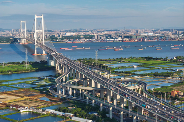 2024年10月2日,广东南沙大桥上的车流和狮子洋水道的船舶来来往往(无人机照片)。新华社记者 刘大伟 摄