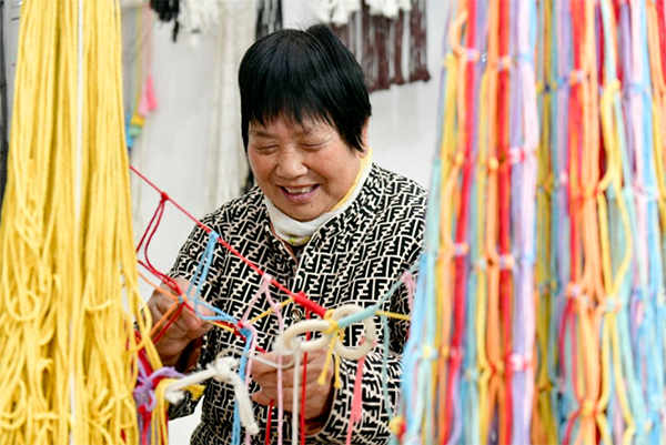 2024年12月13日,在山东省惠民县姜楼镇一处巾帼共富工坊,工作人员在编织绳网。新华社记者 郭绪雷 摄