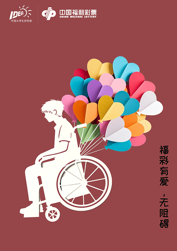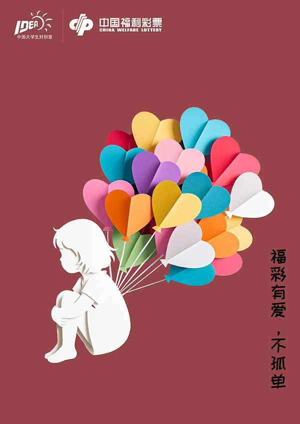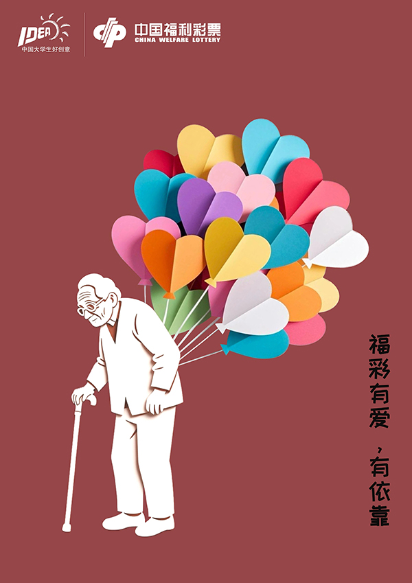 点评:《福彩有爱》这组作品以红色为底色,通过不同人群(儿童、残障人士、老人)与彩色气球的组合,直观展现福彩公益覆盖的帮扶群体。画面简洁且富有象征意义,气球寓意希望,不同形象凸显福彩对弱势人群的关怀,传递出福彩公益助力每个群体拥抱美好生活的温暖理念,视觉语言清晰,公益主题鲜明。
