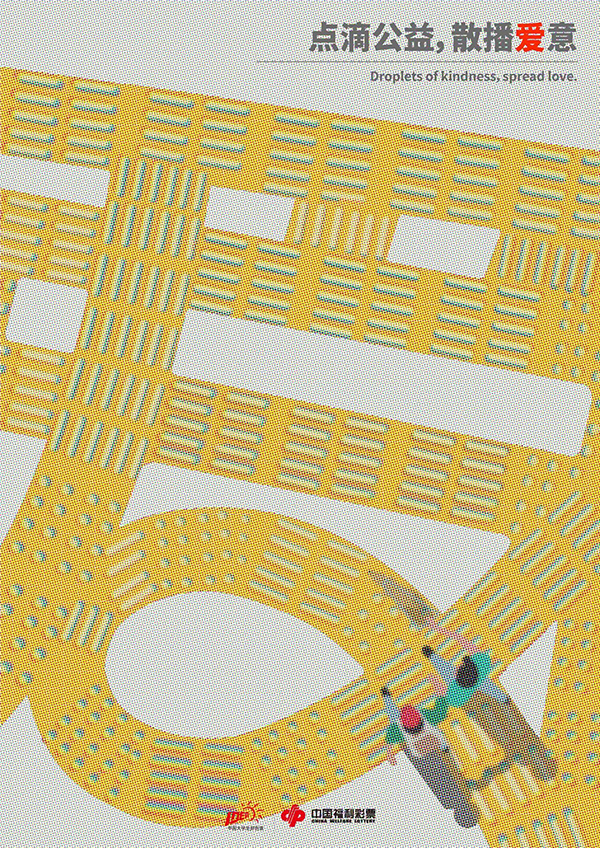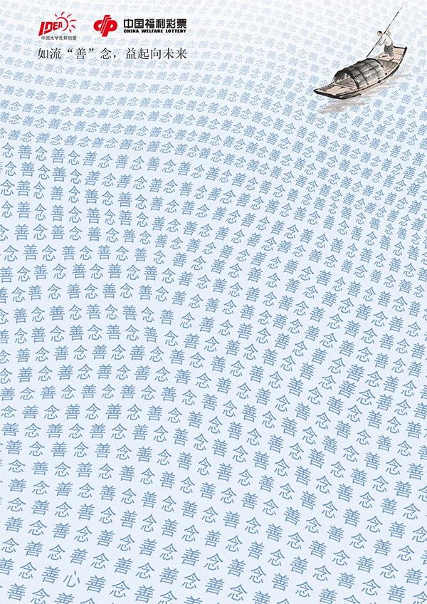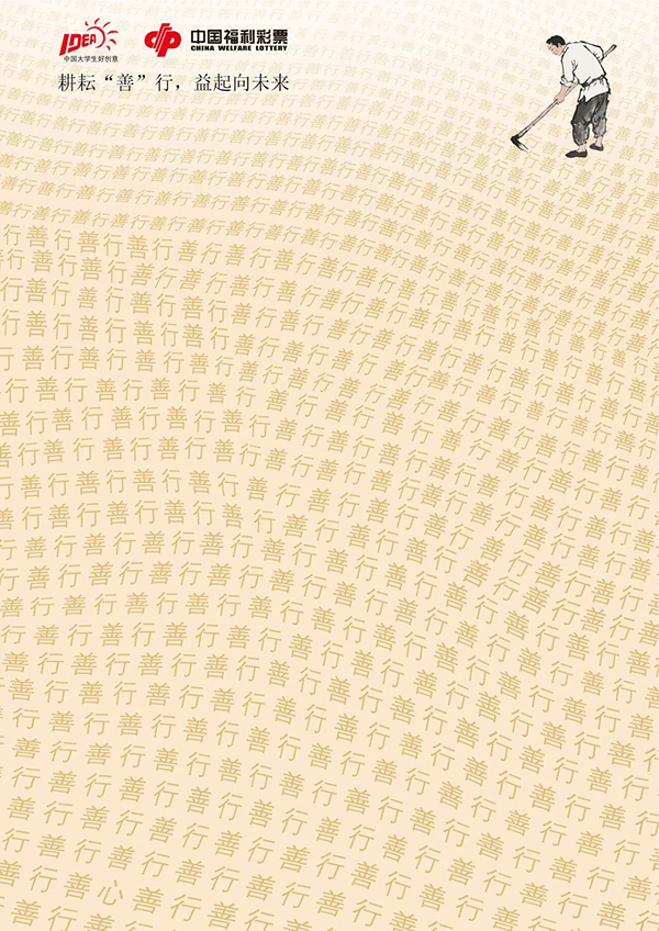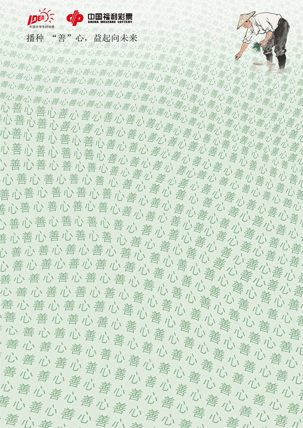 点评:播种“善心”,益起向未来。满版的“善心”“善念”“善行” 文字形成视觉矩阵,既强化主题记忆点,又隐喻公益的广泛参与性;水墨风格的人物插画与文字矩阵结合,传统美学与公益主题碰撞,让“益起向未来”的理念更具文化温度。通过“农耕、行舟”的生活化意象,将抽象的公益精神具象为可感知的行动场景,呼吁大众从心怀善意到践行善举,传递出“人人可公益、处处可行善”的福彩公益主张。