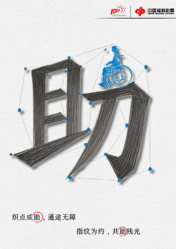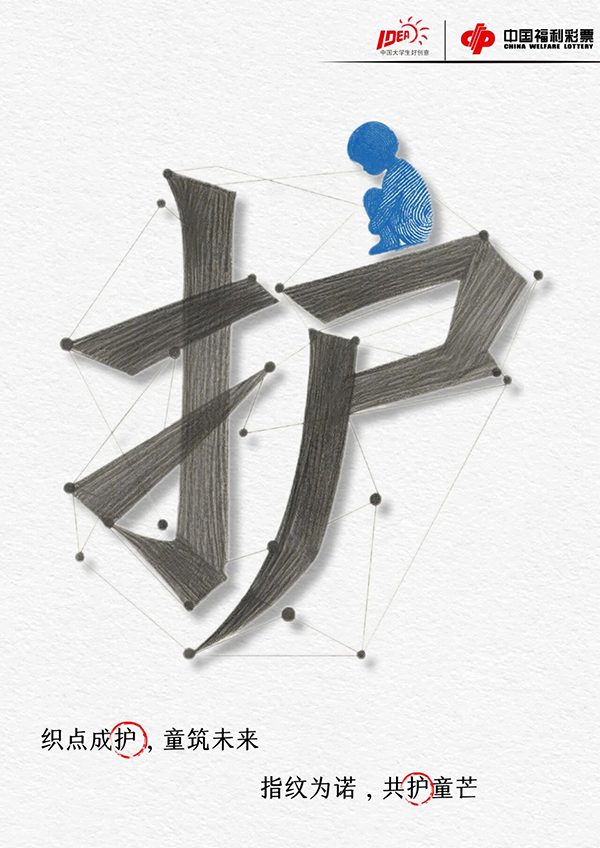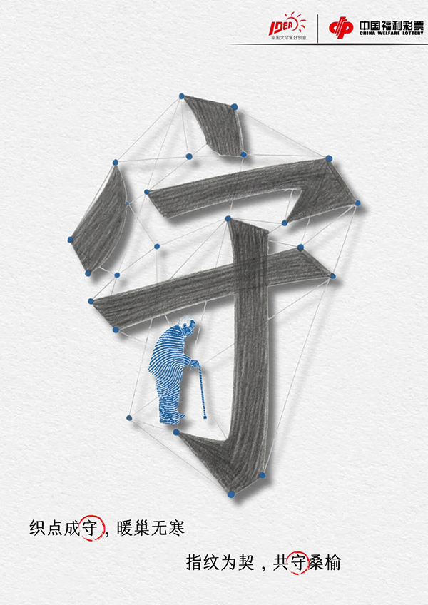 点评:守、护、助,以书法字体结合点线构成,分别融入老人、儿童、残障人士的指纹形象,将 “守桑榆、护童芒、助残障” 的公益主题具象化,点线如公益网络,指纹象征个体参与,视觉语言极具张力。