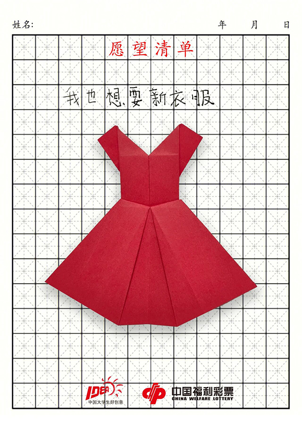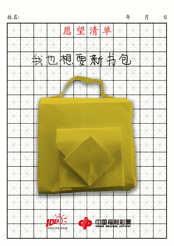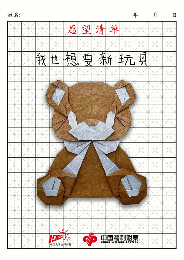 点评:《关爱留守儿童》,用折纸呈现新衣服、新玩具、新书包等儿童朴素愿望,方格纸形式如孩童涂鸦本,充满童真。传递福彩助力儿童梦想、践行公益的温情,创意巧思且情感真挚。