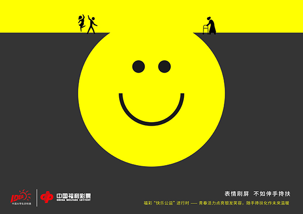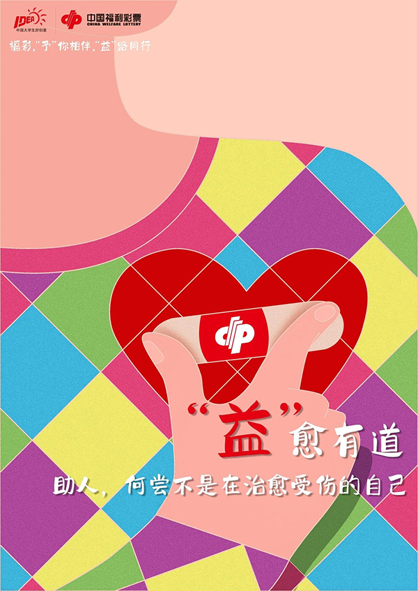 点评:“予”你相伴,“益”路同行。多彩的画面风格充满活力,福彩标识与创意符号的融合自然且醒目,既强化品牌识别度,又通过温暖的视觉语言消解公益的沉重感,让“益路同行” 的理念更具吸引力与传播力。