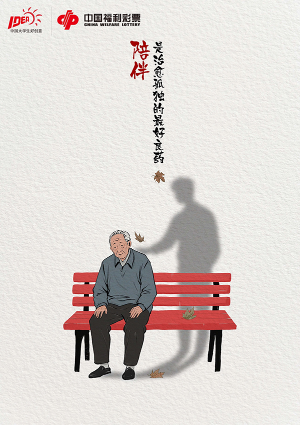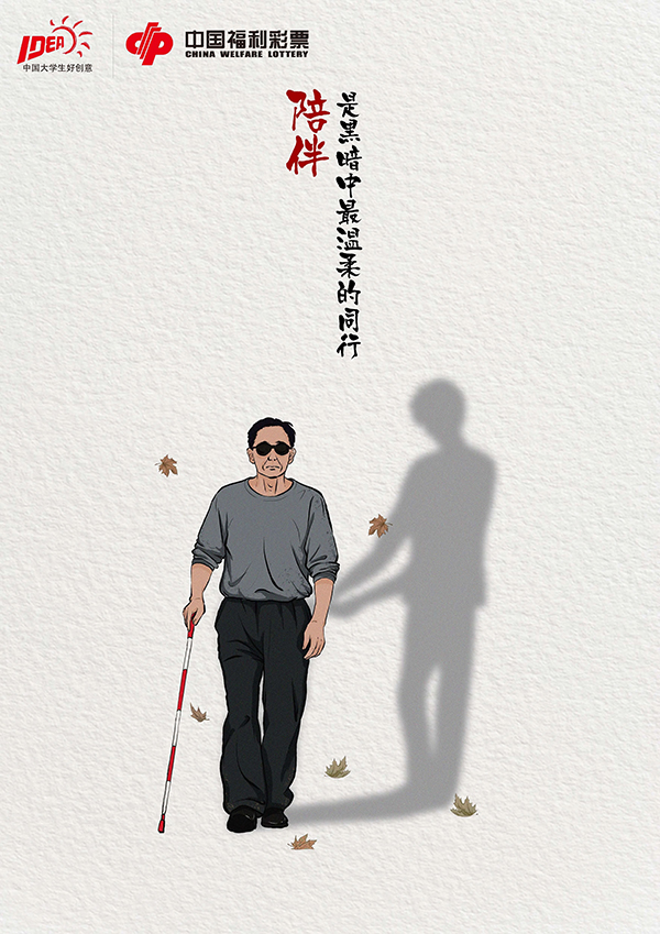 点评:《陪伴》用简约的插画风格搭配留白设计,强化了“陪伴”这一主题的情感浓度,老人的落寞、孩子的孤单、视障人士的迷茫与影子的温暖形成强烈对比,易引发大众对“用陪伴填补公益缺口”的深度思考。