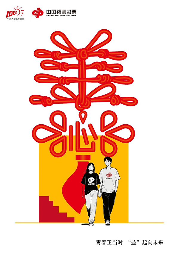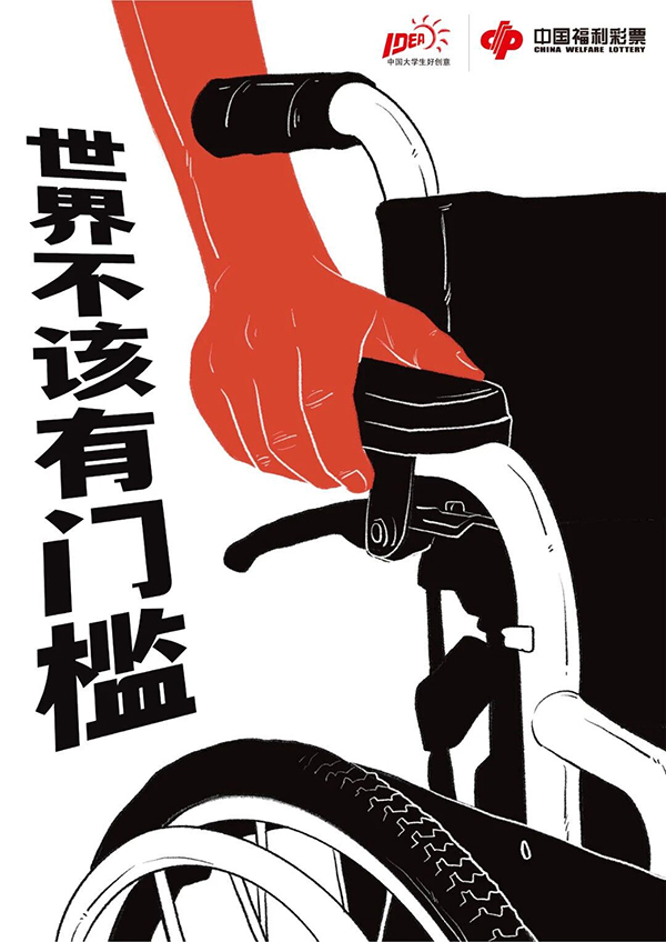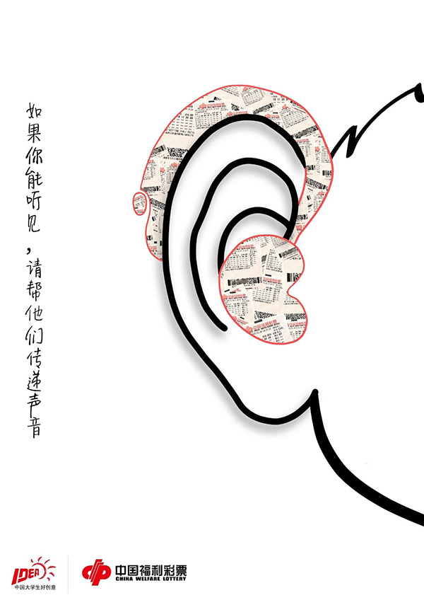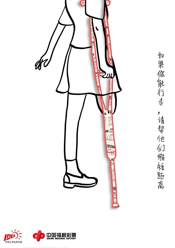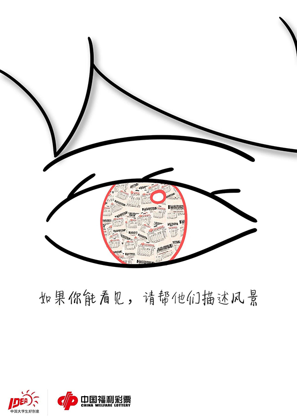 点评:这组作品分别以眼睛、耳朵、拐杖为核心视觉元素,对应视障、听障、肢体残障群体,元素内部填充福彩票面,将公益载体与帮扶对象需求紧密结合,传递福彩公益宗旨。