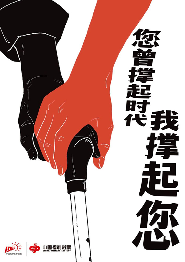 点评:这组作品以红黑白三色对比强化视觉冲击,通过手与拐杖、轮椅、纸飞机的互动,分别对应扶老、助残、助学场景,具象化公益帮扶行动,呼吁大众参与公益、传递温暖,强化福彩的社会担当。